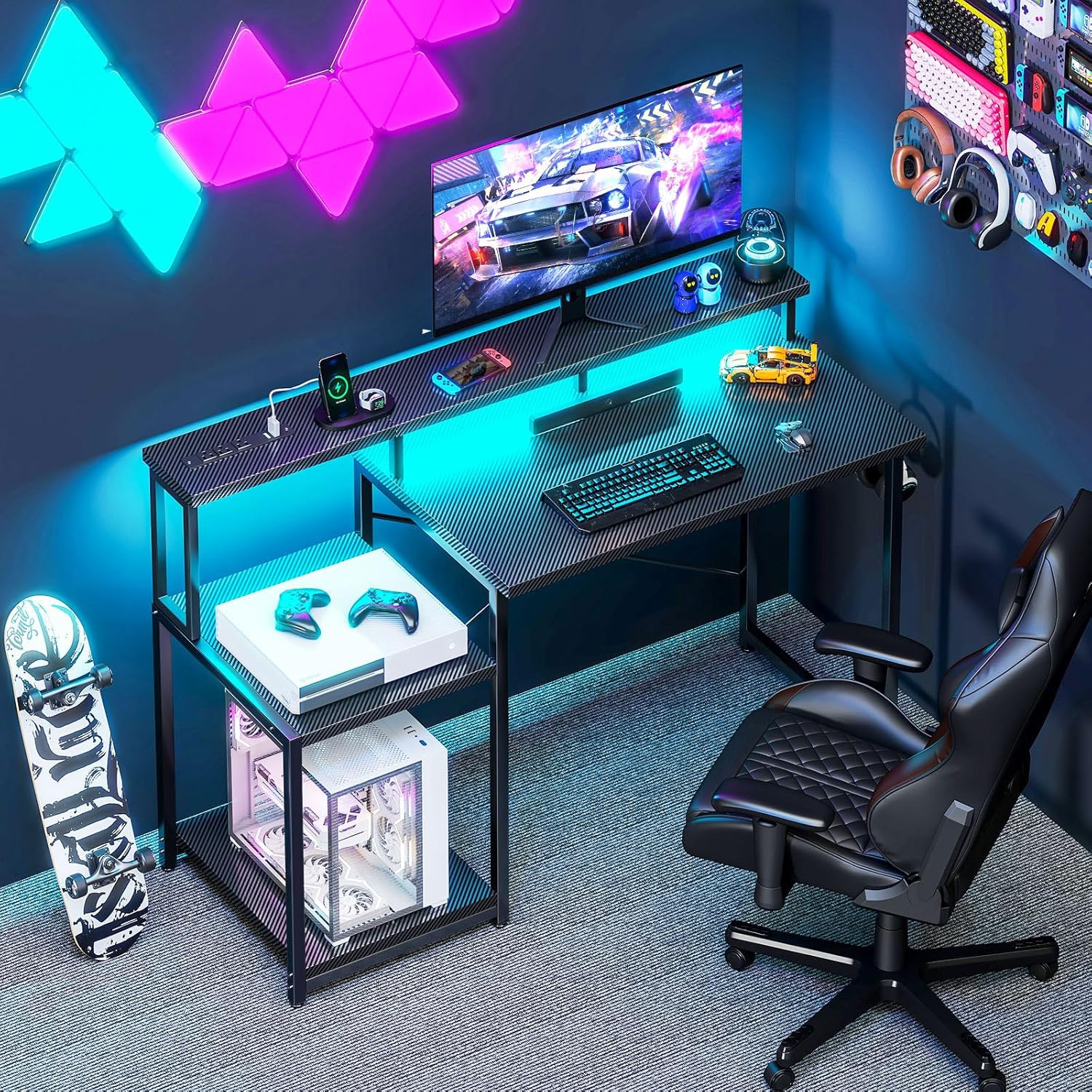 Computer Desk, 48 Inch Gaming Desk with Led Lights & Power Outlet, Office Desk with Printer Storage Shelves, Reversible Desk with Monitor Shelf & Headphone Hook, Carbon Fiber Black