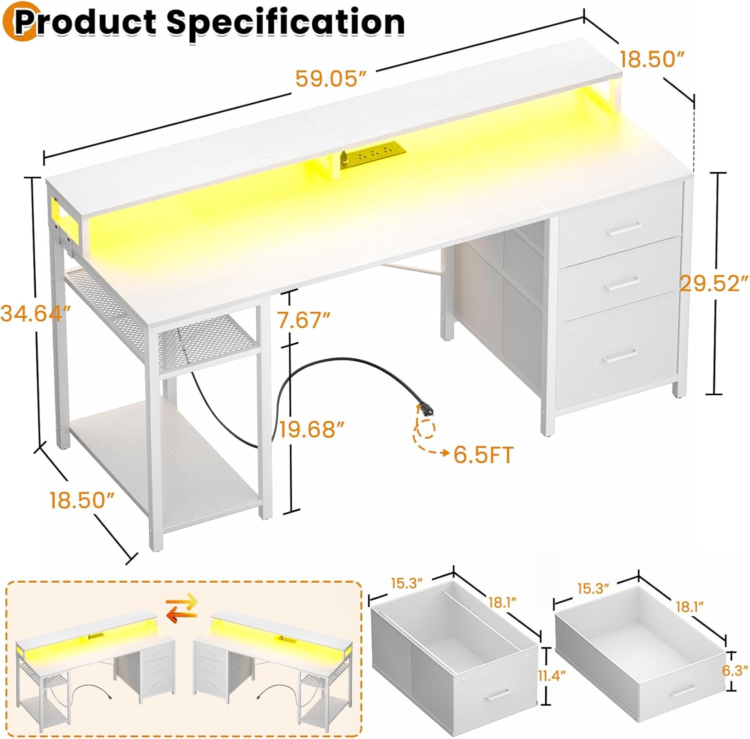 Gaming Desk with LED Lights and Power Outlets, 59 inch Computer Desk with Fabric File Drawers, Home Office Desk with Monitor Stand and Storage Shelves, White