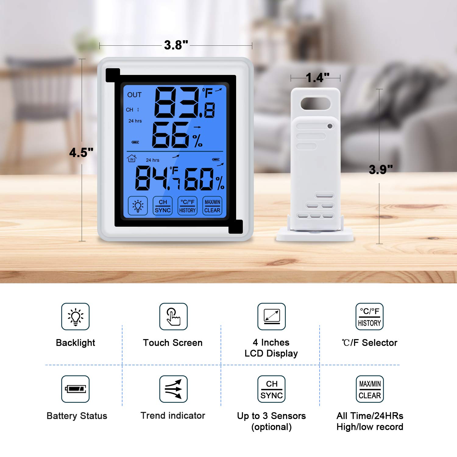 Backlight and Touchscreen: Remote thermometer features touchscreen and 4” high clear HTN LCD, display 178° wide view. Back-lit for use in low light condition.