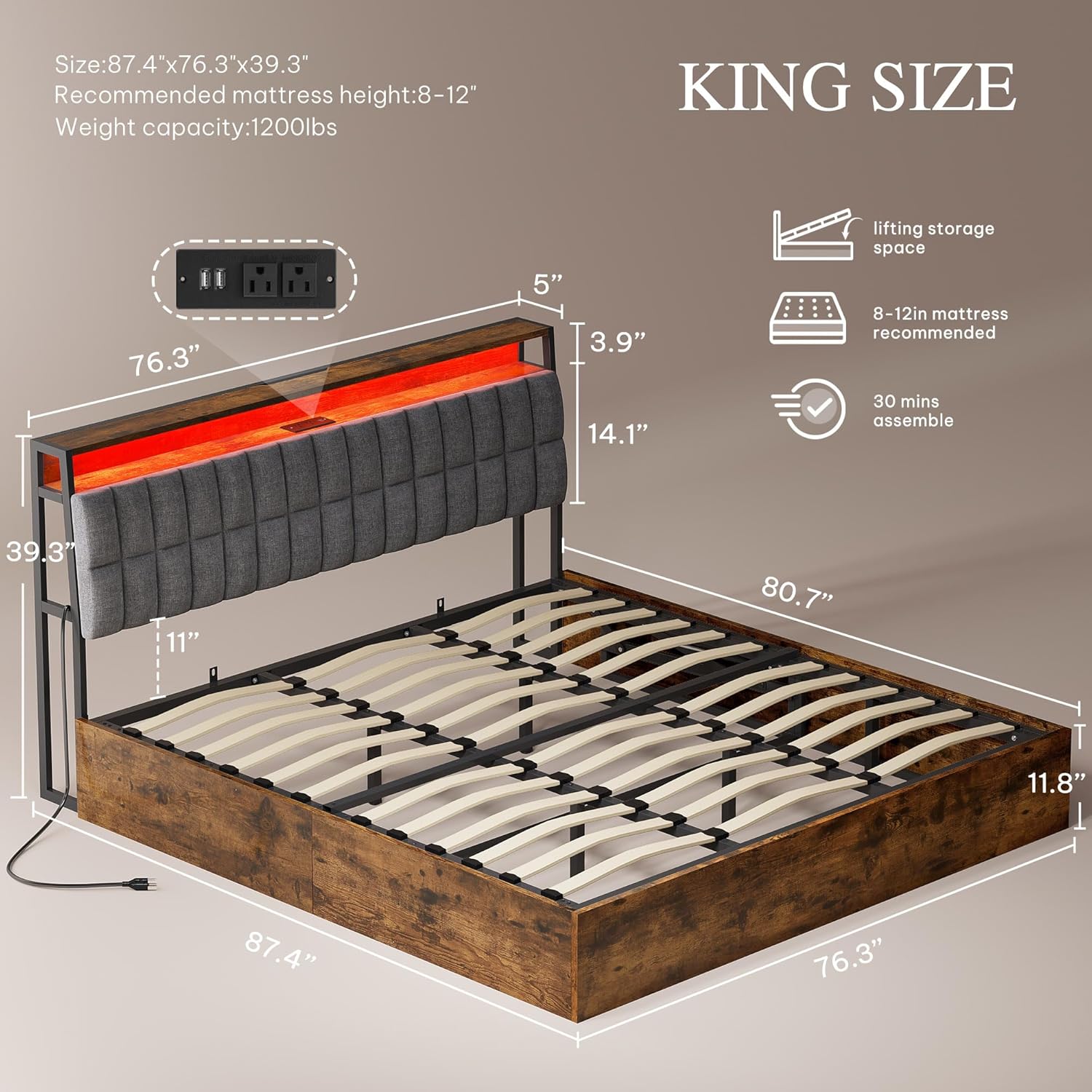 King Size Lift Up Bed Frame with Charging Station & RGB LED Lights, Linen Upholstered Storage Headboard Bed, Heavy Duty Wooden Slats, No Box Spring Needed, Noise Free, Rustic Brown and Grey