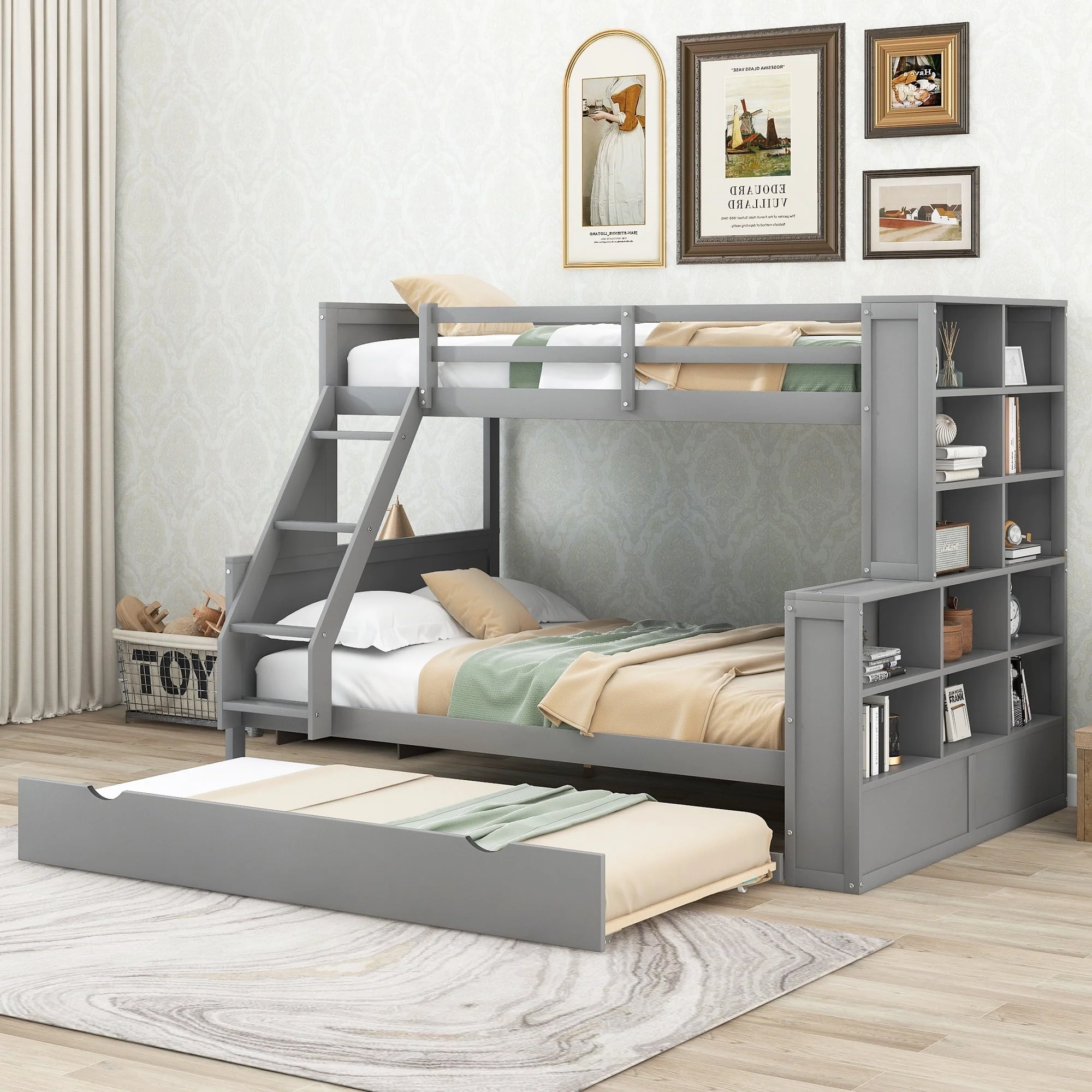Pine Wood Twin over Full Bunk Bed with Trundle and Display Shelves for Kids Bedroom, Gray